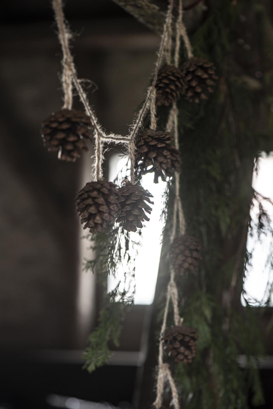 Echte Zapfen auf Schnur, Länge ca. 140 cm, Zapfen ca. 10 Stück. Material: echte Zapfen auf Juteschnur.